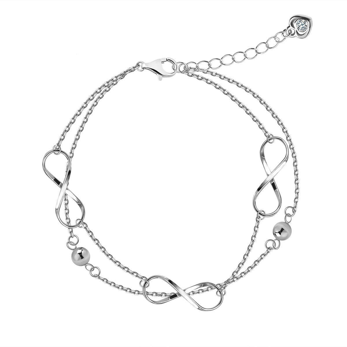 Znaki nieskończoności o wymiarach 17x5 mm, kulki o średnicy 4 mm. Długość bransoletki regulowana 16+3 cm.
