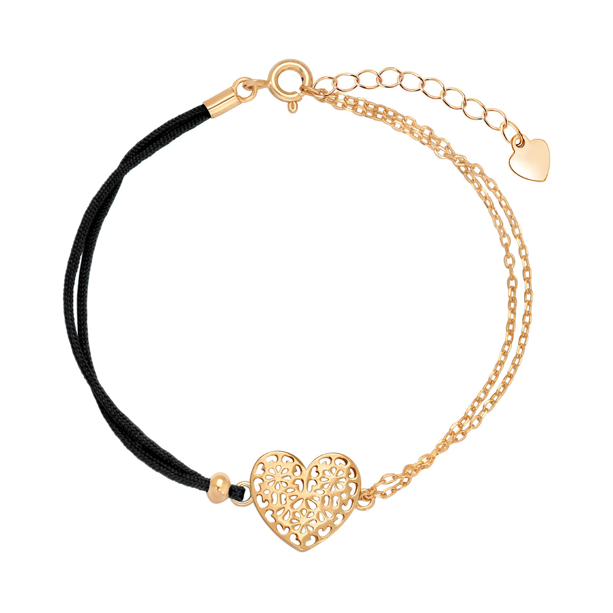 Pozłacana bransoletka (srebro 925) na czarnym sznurku. Jej sercem jest ażurowe, dwustronne serce o płaskim profilu. Wyjątkowy charakter nadaje asymetryczne połączenie: z jednej strony podwójny łańcuszek o szlifowanym splocie ankier, z drugiej – minimalistyczny sznurek z ozdobną kulką. Lekka, nowoczesna i efektowna.