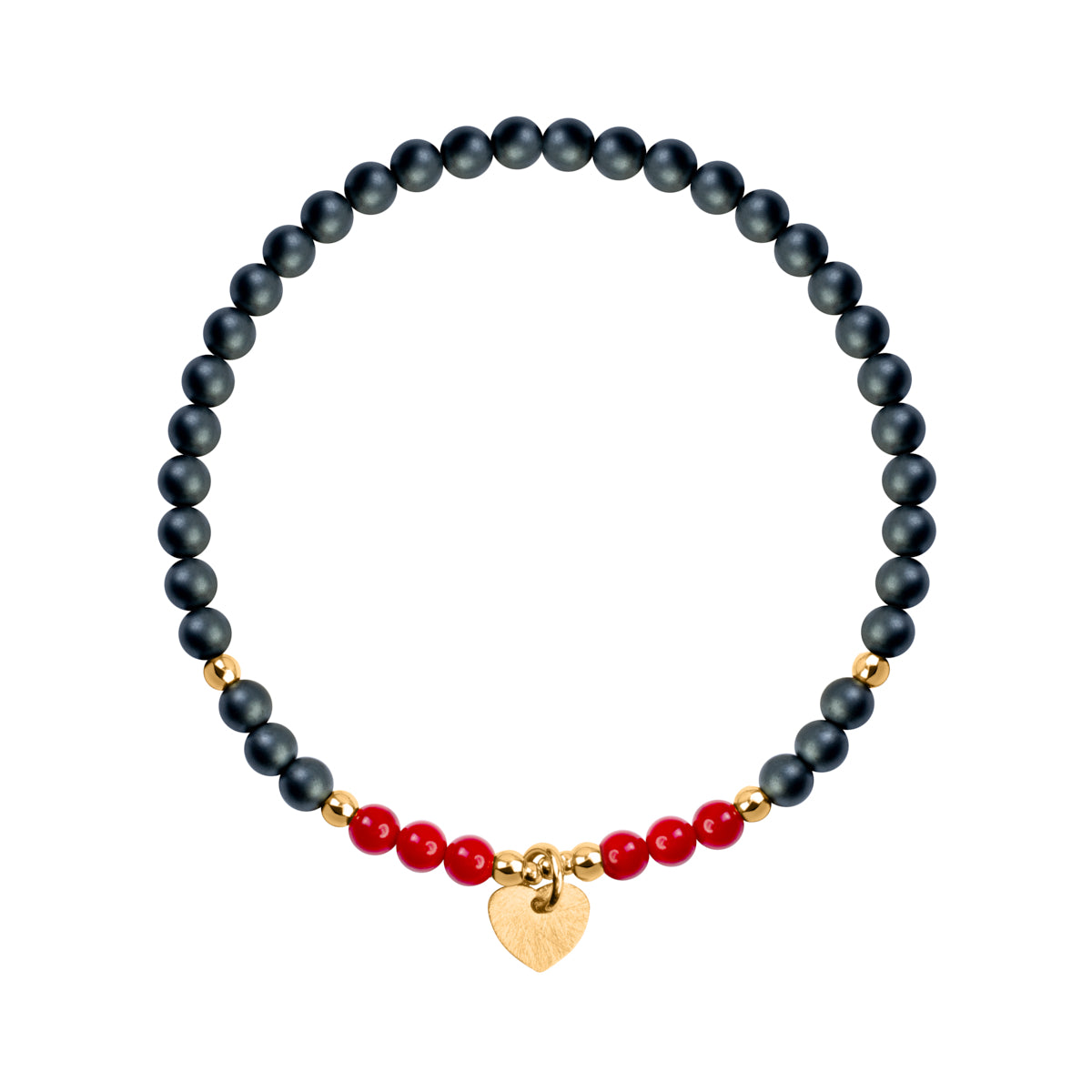 Bransoletka wykonana ze srebra pozłacanego, hematytu i muszli. Na wytrzymałą, silikonową strunę nawleczone są szare, matowe kuleczki z hematytu i czerwone, lśniące, z muszli. Kulki poprzetykane są koralikami ze srebra pozłacanego, na których nawleczona jest zawieszka serce. Geometryczny szlif na powierzchni serca, nadaje niepowtarzalny połysk.