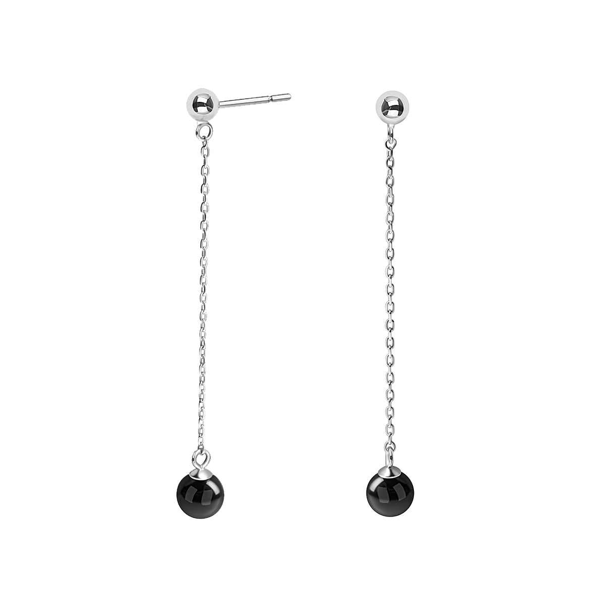 Kolczyki wykonane są z rodowanego srebra próby 925 oraz czarnego agatu. Dwie gładkie, polerowane kule — jedna z połyskującego agatu, druga srebrna — połączone są delikatnym łańcuszkiem o szlifowanych ogniwach. Kolczyki przyciągają wzrok, subtelnie kołysząc się przy każdym ruchu.