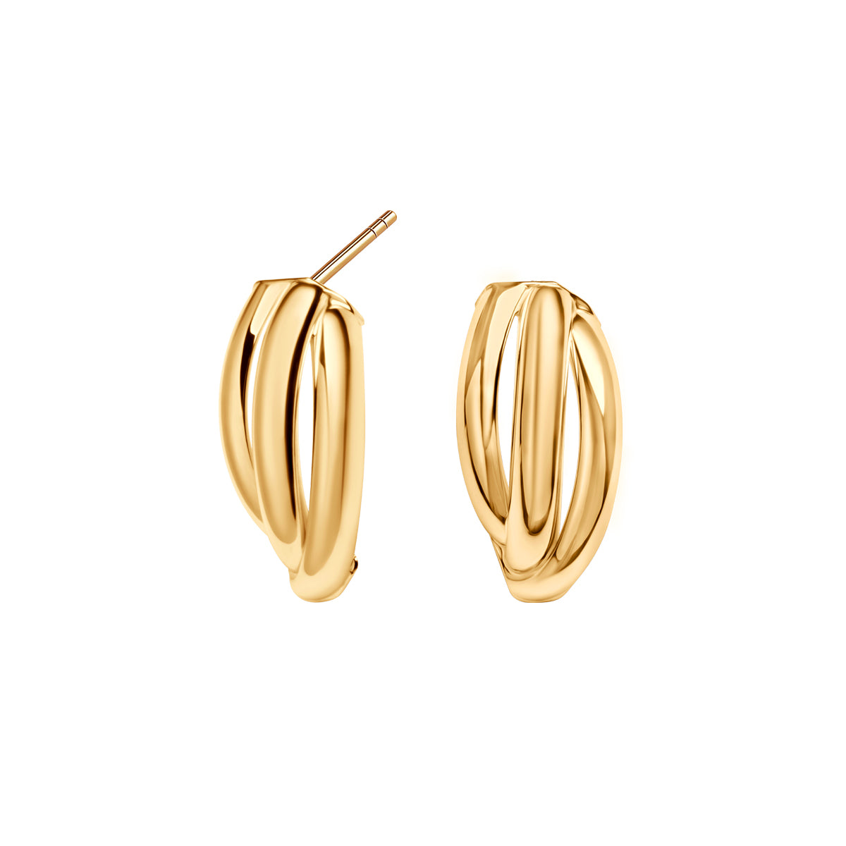 Kolczyki wykonane ze złota próby 333. Ich unikalna forma to trzy gładkie i lśniące rurki, które płynnie łączą się w dynamiczny łuk, delikatnie "obejmujący" linię ucha. Intensywny połysk polerowanej powierzchni przyciąga wzrok, czyniąc tę biżuterię centralnym punktem każdej szykownej kreacji.