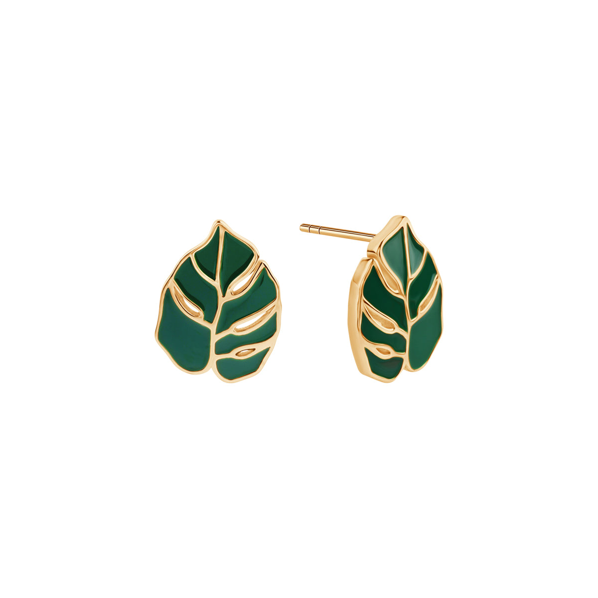 Kolczyki ze srebra pozłacanego próby 925 w kształcie liścia monstery. Zielona emalia jubilerska, pokrywająca lekko wypukłą powierzchnię liścia, pięknie kontrastuje z błyszczącym złotem. Mocowanie do ucha sztyftem.