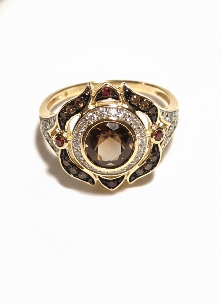 Spektakularny pierścionek 585 z certyfikatem Verony. Okazały, ażurowy design z centralnym kwarcem dymnym, otoczonym olśniewającą aureolą białych diamentów. Unikatowy wzór dopełniony akcentami z brązowych diamentów oraz dwoma granatami. Szlachetne złoto i kamienie zapewniają atrakcyjny i niepowtarzalny wygląd.