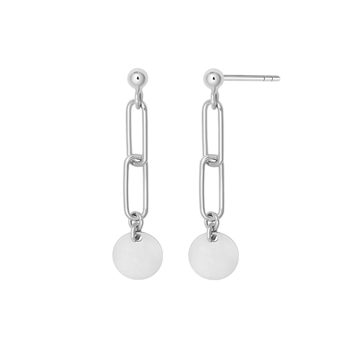 Efektowne kolczyki wykonane z rodowanego srebra próby 925. Ich urzekający design tworzą dwa duże ogniwa o splocie typu ankier, zakończone srebrnym, błyszczącym kółkiem. Kolczyki pięknie poruszają się przy każdym ruchu. Ucho zdobi mocowanie na wygodny sztyft z kulką. Długie i pełne blasku, idealnie dopełnią każdą stylizację, dodając jej wyrafinowania.