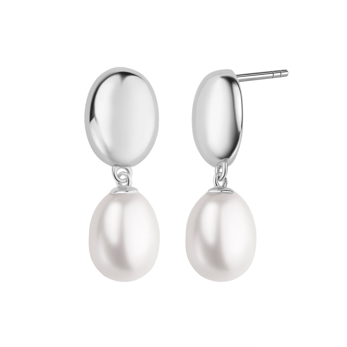 Srebro rodowane pr. 0,925 i perły Biwa (z certyfikatem Verony) w minimalistycznej, owalnej oprawie. Polerowana, lustrzana powierzchnia idealnie współgra z blaskiem pereł. Ruchome połączenie nadaje całości lekkości i dynamiki. Kwintesencja ponadczasowego szyku i elegancji.
