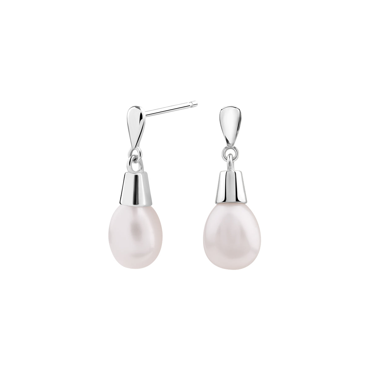Kolczyki wykonane ze srebra pr. 0,925 i pereł. Perły naturalne, słodkowodne, hodowlane. Barwa pereł białoperłowa, z połyskiem. Kształt kropli, powierzchnia niejednorodna, charakterystyczna dla naturalnego wyrobu. Perła przymocowana do srebrnego kapturka, a ten do srebrnej łezki ze sztyftem. Do pereł dołączamy certyfikat Verona. Biżuteria elegancka.
