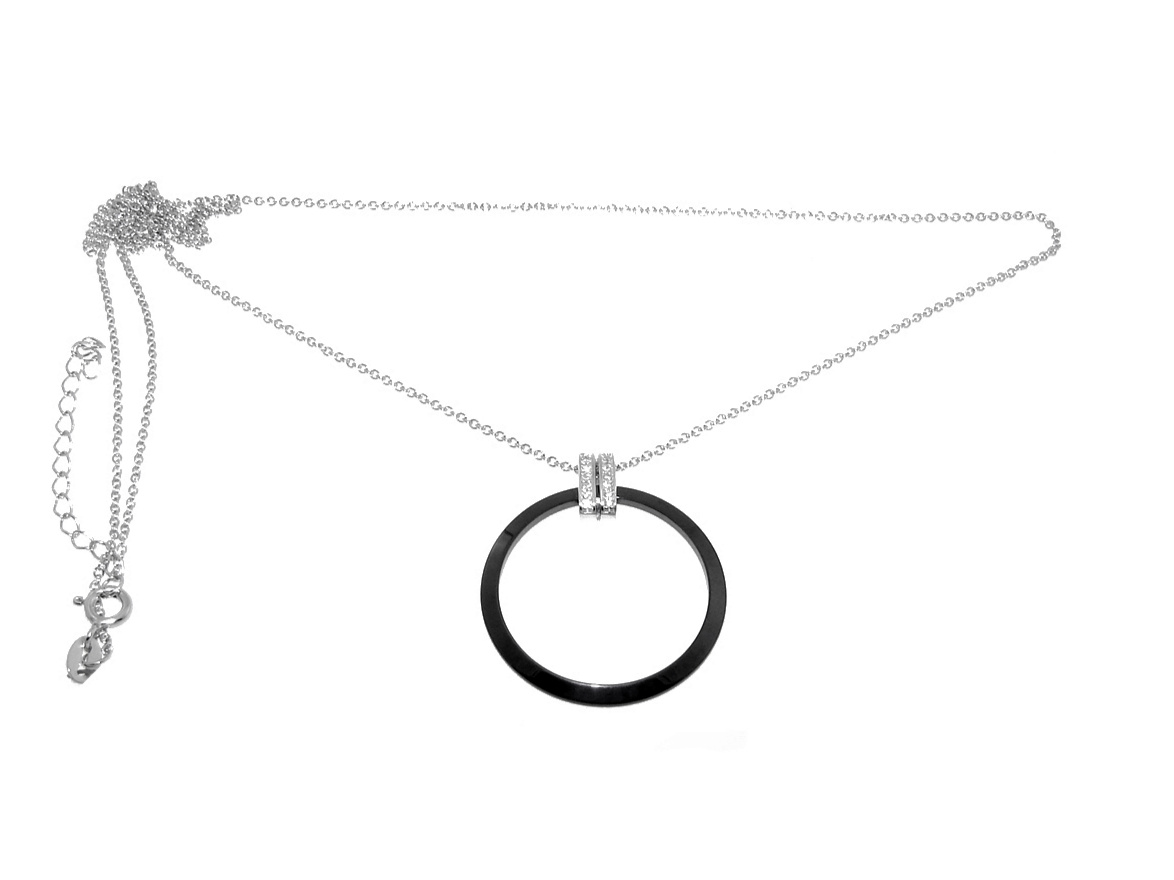 Bransoletka wykonana ze srebra rodowanego próby 0,925, emalii jubilerskiej i cyrkonii. Część centralna to srebrne kółko-obręcz pokryte z obu stron czarną emalią. Do kółka przymocowane dwa srebrne uchwyty ozdobione cyrkoniami. Uchwyty przesuwają się po kółku. Następnie kulka srebrna i łańcuszek splot ankier, wykończony kuleczką. Nowoczesny design.