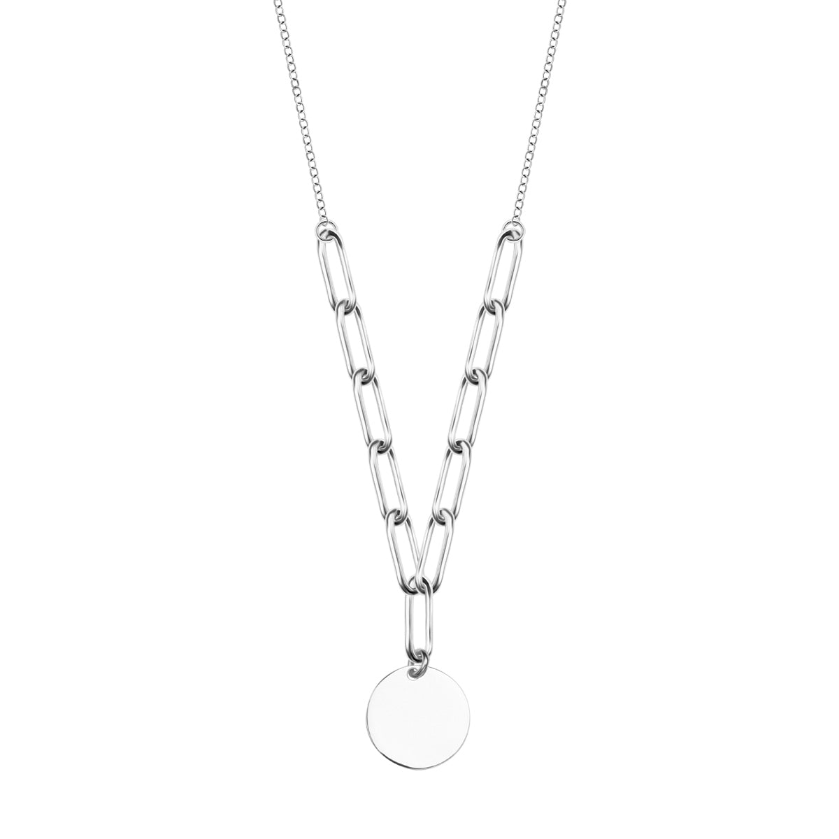 Kółko o średnicy 14 mm. Duże ogniwo o wymiarze 13 x 5 mm. Drobniejszy łańcuszek o szerokości 1,6 mm. Długość naszyjnika regulowana 42+5 cm=47 cm.