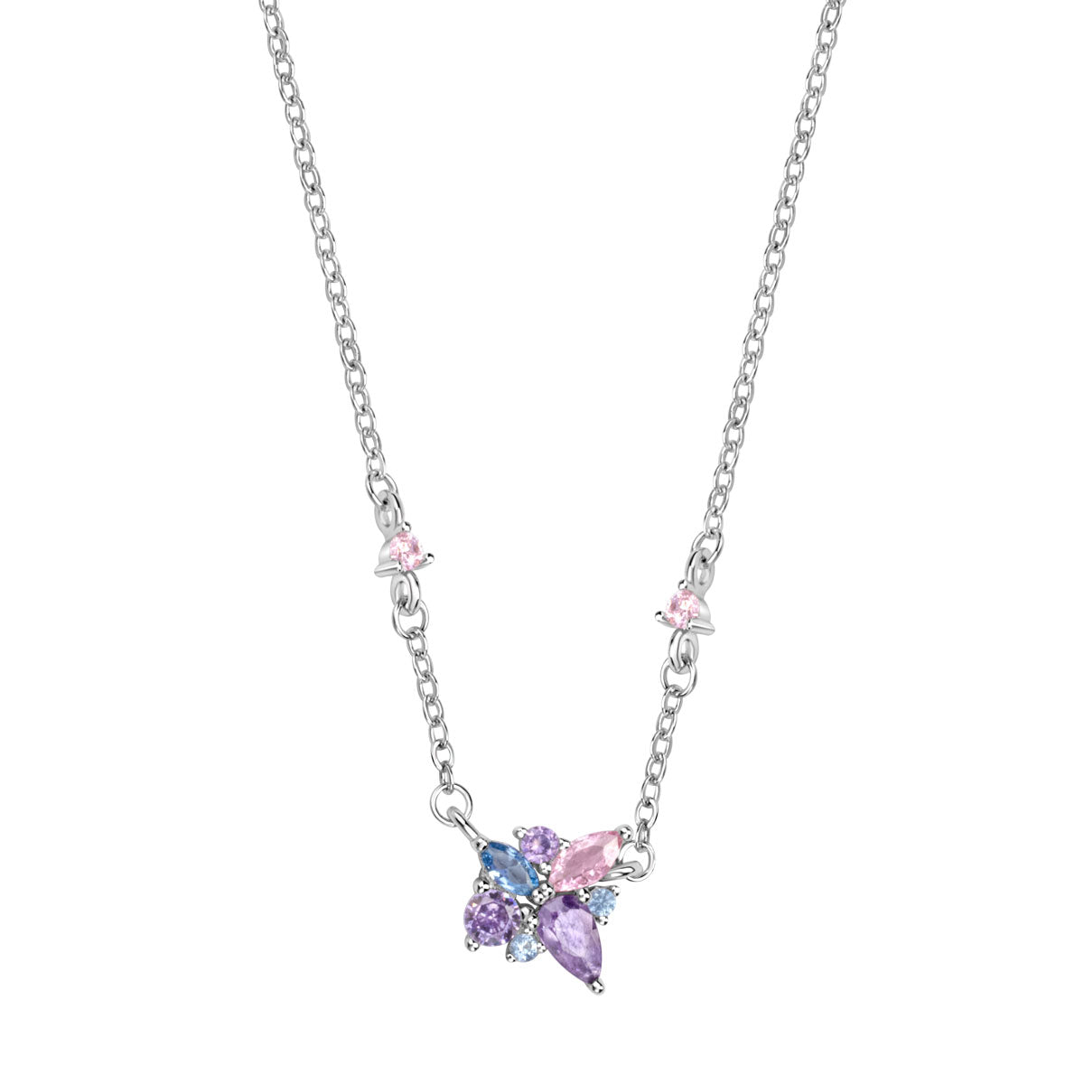 Naszyjnik wykonany ze srebra rodowanego próby 925 i cyrkonii. Centralnie umieszczona zawieszka to uroczy motyw motyla, wysadzany pastelowymi cyrkoniami w odcieniach różu, błękitu i fioletu. Łańcuszek w naszyjniku o splocie ankier i szlifowanych ogniwach, ozdobiony cyrkoniami w odcieniach barw motylka. Kolekcja Tajemniczy Ogród by Verona.