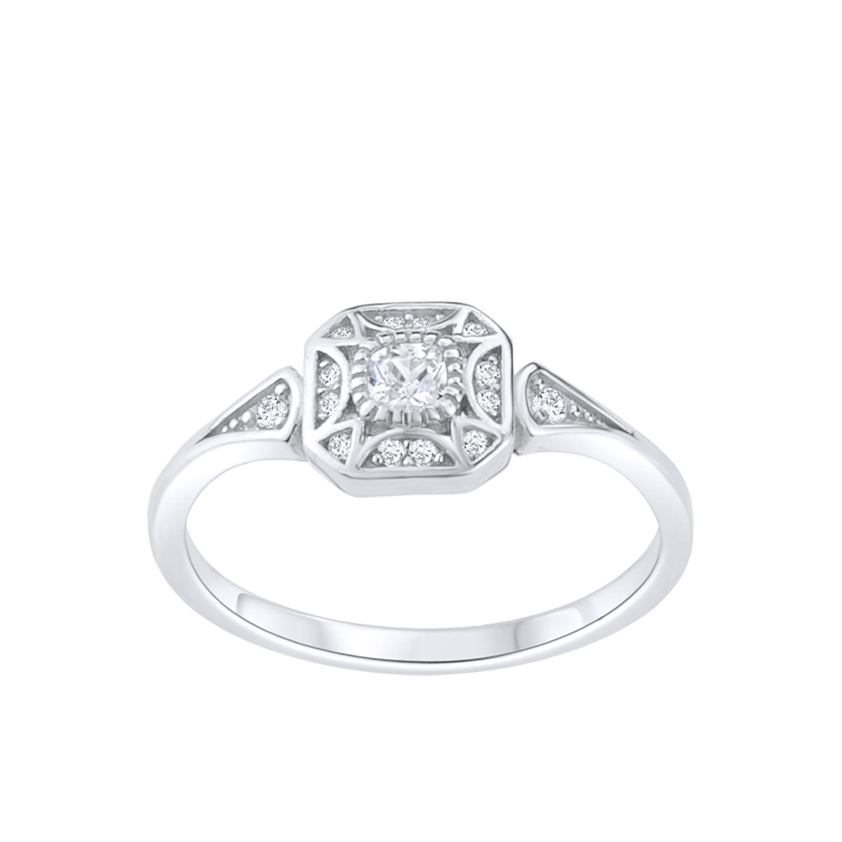 Srebrny pierścionek w stylu art déco, który łączy geometryczną formę z blaskiem cyrkonii. Centralny kamień osadzony w kwadratowej koronie oraz subtelne zdobienia nadają mu unikalny charakter vintage. Wykonany ze srebra rodowanego próby 0,925, stanowi ponadczasowy dodatek, który idealnie sprawdzi się jako szykowny akcent codziennej stylizacji.