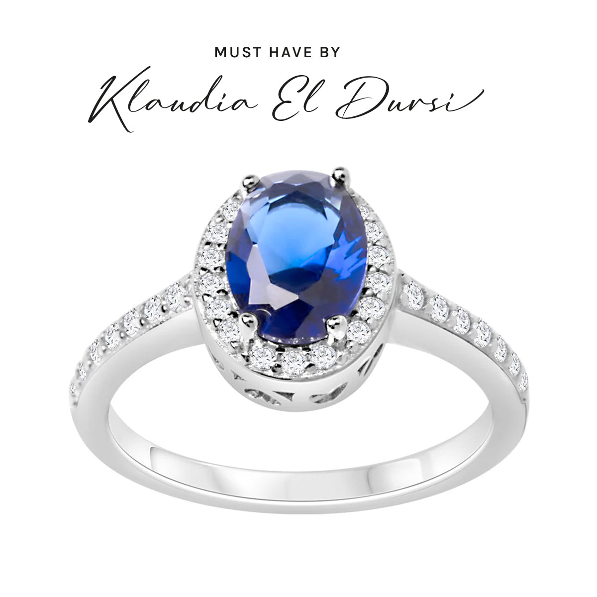 Ten pierścionek to kwintesencja ponadczasowej elegancji. Wykonany z najwyższej próby rodowanego srebra 925, zachwyca blaskiem. Sercem projektu jest cyrkonia o głębokiej, szafirowej barwie i szlachetnym, owalnym kształcie. Jej urodę podkreśla świetlisty nimb drobnych, kryształowych cyrkonii, które kaskadą przechodzą na front obrączki.