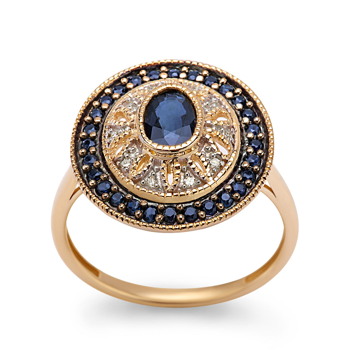 Pierścionek wykonany ze złota próby 0,585, diamentów i szafirów. Kształt owalny. Centralnie umieszczony szafir, lekko uniesiony ponad powierzchnię wzoru. Dokoła szafiru oprawa ażurowa z dziesięcioma diamencikami. Następna otoczka z szafirów barwy ciemnoszafirowej. Do pierścionka dołączony certyfikat kamieni naturalnych. Kolekcja limitowana.