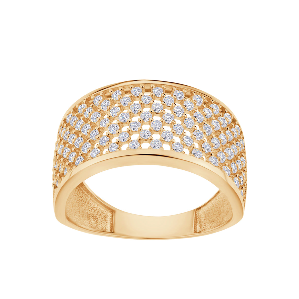 Pierścionek wykonany ze złota próby 333 i cyrkonii barwy kryształowej. Wzór to ażurowa, szeroka obrączka. Ażur utworzony z opraw cyrkonii typu "pazurki". Dzięki szlifowaniu cyrkonii, pierścionek pięknie lśni na palcu. To idealny wybór dla kobiet szukających wyrazistej biżuterii, która luksusowo dopełni każdą elegancką stylizację.