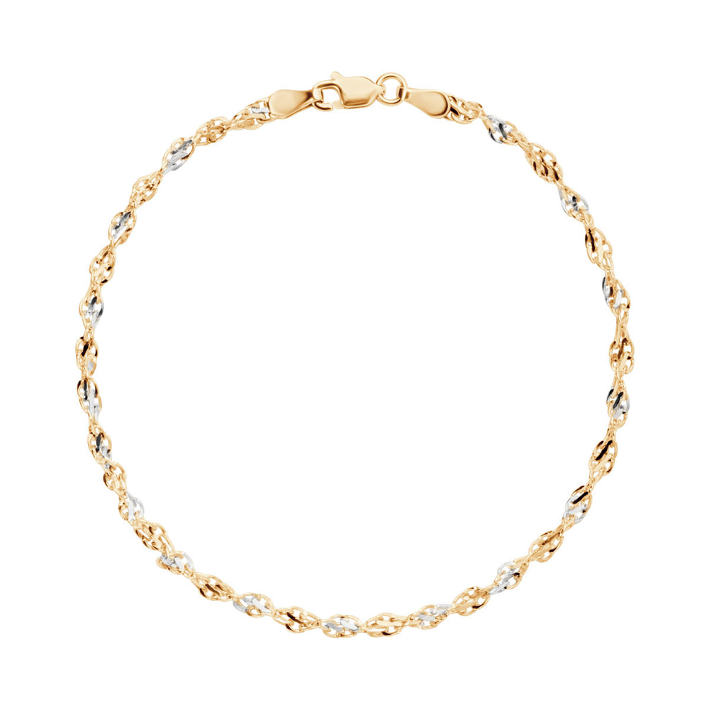 Bransoletka wykonana ze złota próby 333. Płaski, szlifowany splot łańcuszka, dodatkowo skręcony, bardzo ładnie się błyszczy. Splot łączy dwa kolory złota: biały i żółty. Bransoletka miękko układa się wokół ręki. To ponadczasowy dodatek, który pasuje do jeansów, garsonki i małej czarnej.