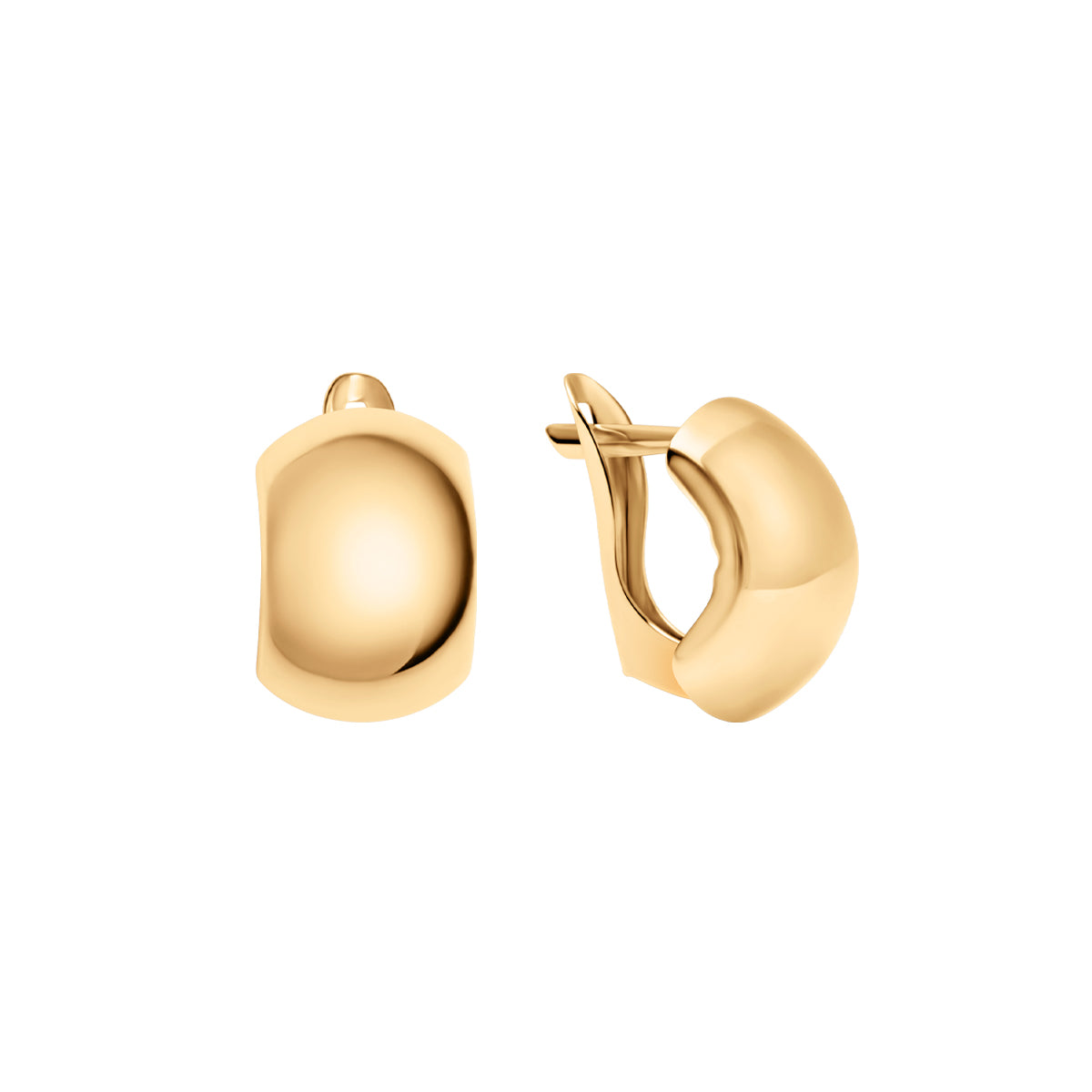 Złote kolczyki próby 0,333. Ich nowoczesny design to wypukły geometryczny łuk przymocowany do klasycznego angielskiego bigla. Powierzchnia gładka i polerowana, co zapewnia wyjątkowy blask. Dzięki swojej formie, kolczyki pięknie układają się w uchu, dodając elegancji każdej stylizacji.