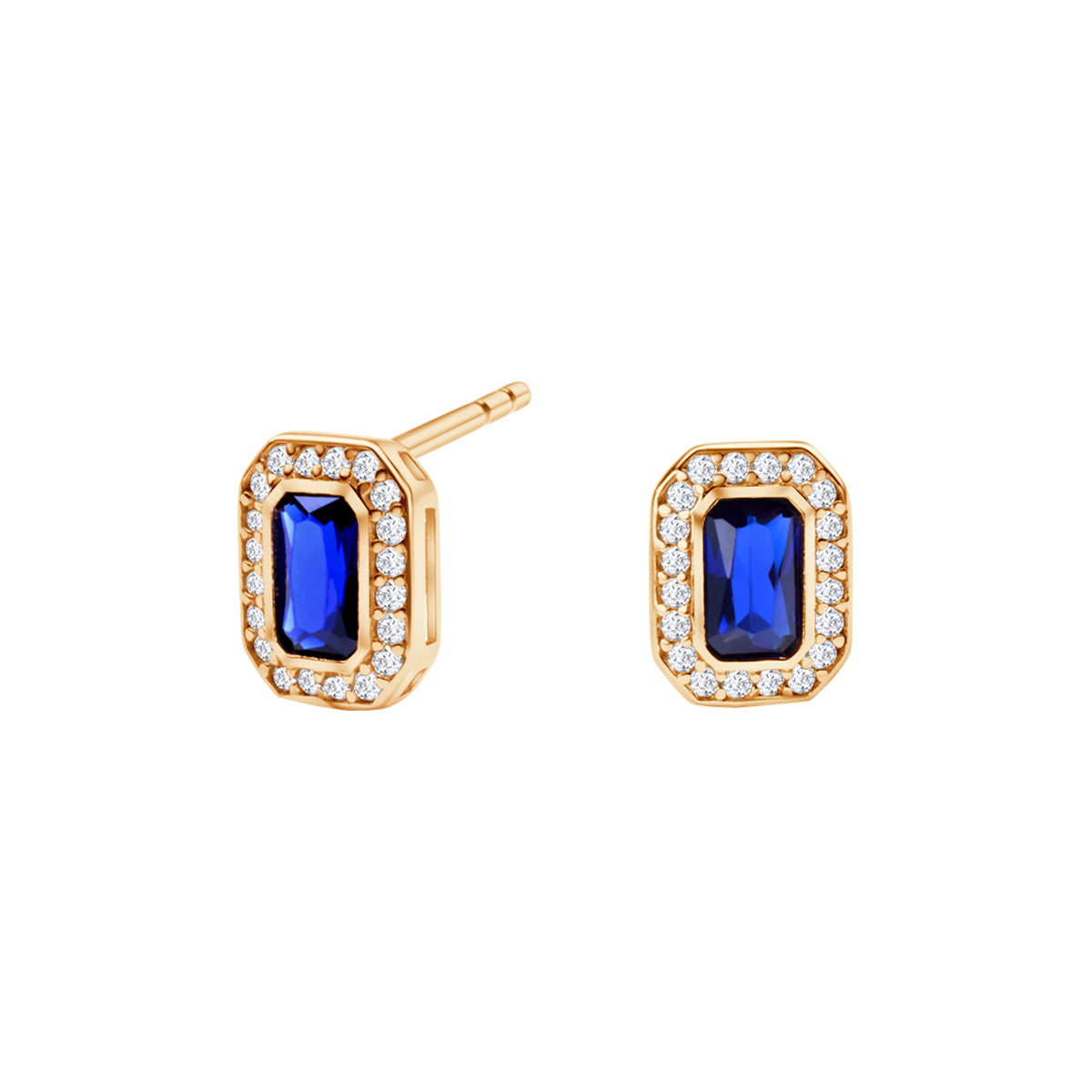 Kolczyki wykonane ze złota próby 333, ozdobione centralnie, prostokątną cyrkonią w kolorze ciemnoszafirowym. Kamień główny otoczony jest lśniącymi cyrkoniami kryształowymi. To ponadczasowa elegancja zamknięta w klasycznym wzorze. Idealne kolczyki na co dzień i na specjalne okazje.