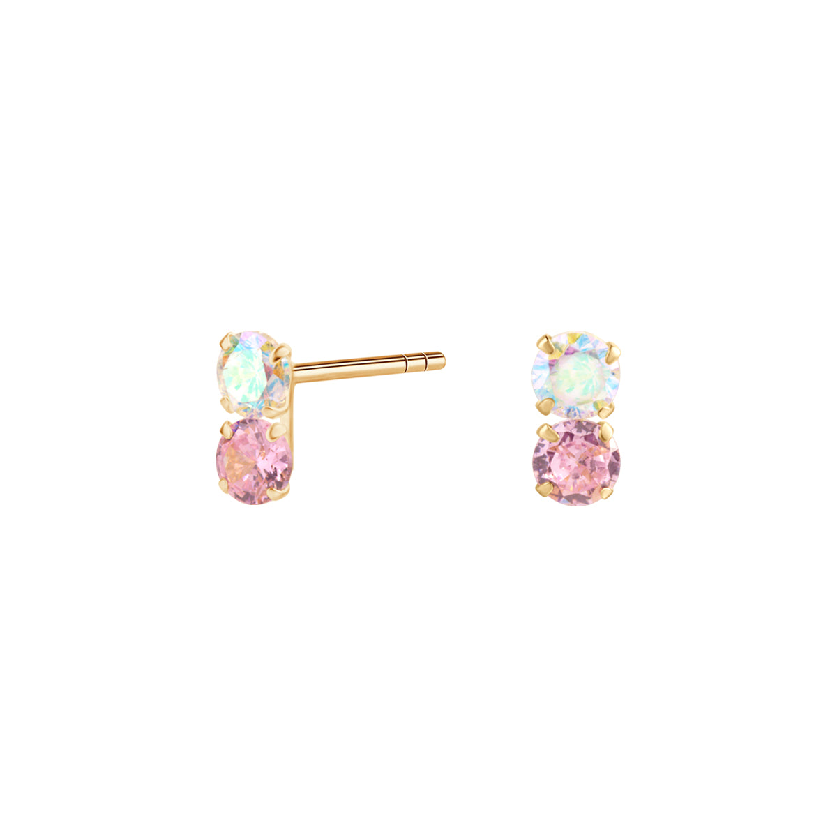 Delikatne kolczyki wykonane ze złota próby 333, ozdobione dwiema cyrkoniami. Jedna w odcieniu krystalicznym, druga w delikatnym różu. Połączone kamienie, dzięki wielobarwnym inkluzjom, tworzą efekt opalizowania, mieniąc się wielobarwnymi refleksami, które rozświetlą każdą stylizację, przyciągając wzrok z subtelną elegancją.