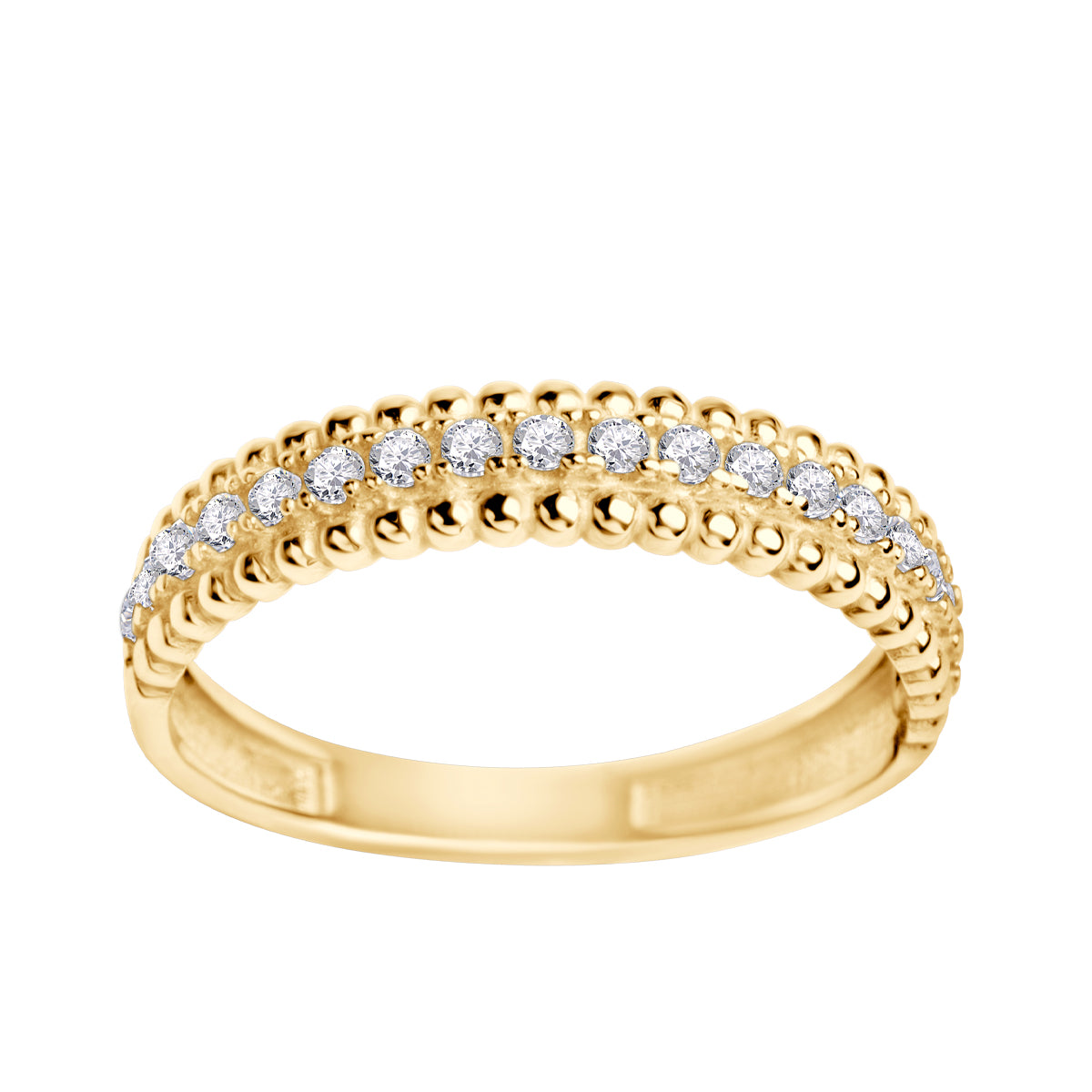Złoty pierścionek (próba 333) o subtelnie wypukłym profilu typu obrączka. Brzegi zdobione kunsztownym granulowaniem, a środek wysadzany lśniącymi, kryształowymi cyrkoniami. Efektowny blask i minimalistyczna forma sprawiają, że idealnie prezentuje się solo lub w zestawach typu stacking.