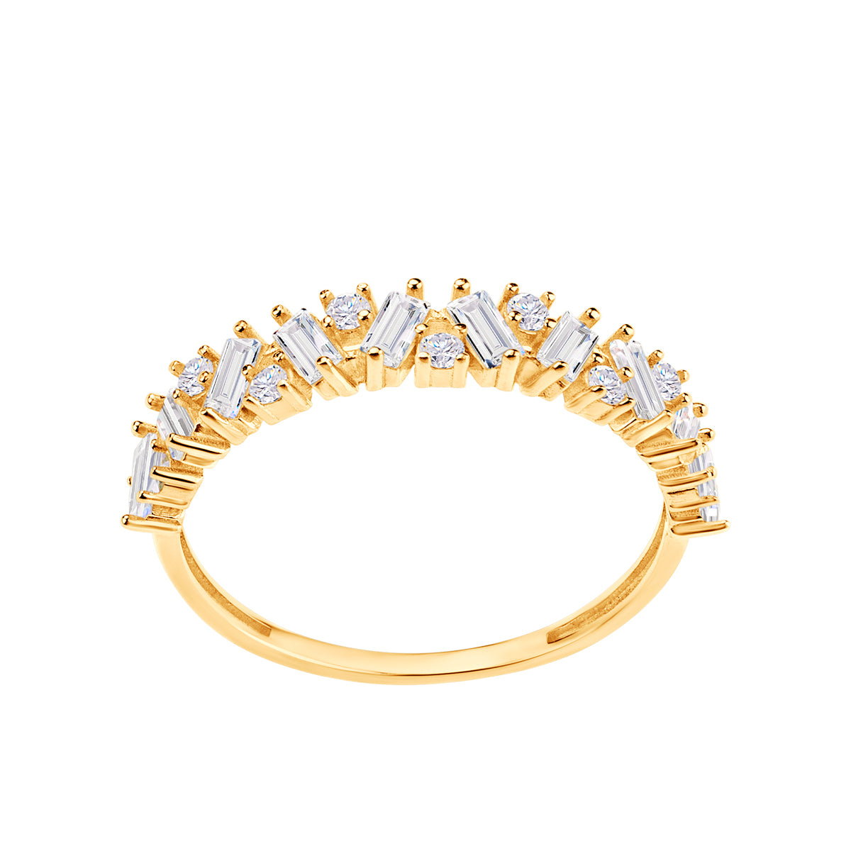 Złoty pierścionek pr. 333 o ażurowej formie obrączki. Front zdobią kryształowe cyrkonie o szlifie okrągłym oraz bagietkowym, które lśnią niczym lodowe kryształki. Idealny do noszenia solo lub w modnych zestawach. Kwintesencja elegancji.