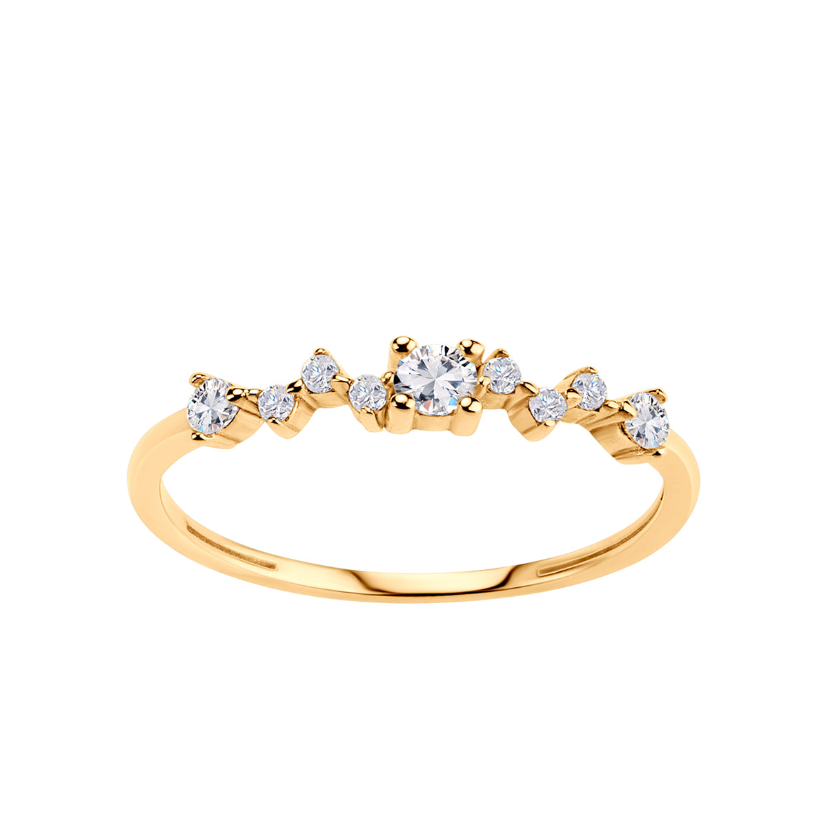 Pierścionek wykonany ze złota próby 333, zachwyca formą delikatnej obrączki wysadzanej „rozrzuconymi” cyrkoniami o kryształowej barwie. Serce wzoru stanowi centralnie umieszczony, większy kamień, który wieńczy kompozycję. Delikatny, lśniący i absolutnie uniwersalny – idealny dodatek na co dzień i na specjalne okazje.