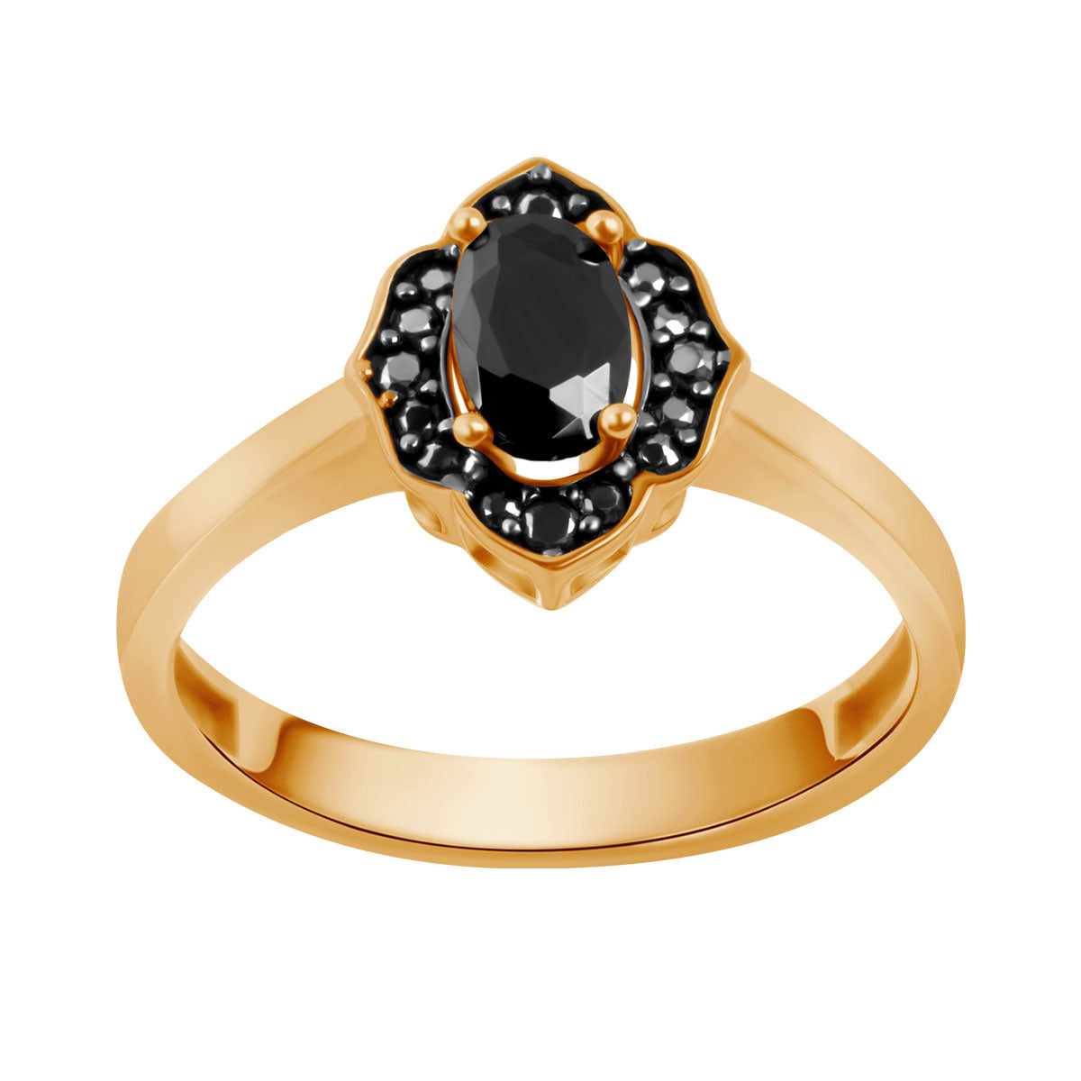 Elegancki pierścionek z żółtego złota próby 333, ozdobiony kontrastującymi, czarnymi cyrkoniami. Centralna cyrkonia w kształcie owalu została otoczona misternym układem okrągłych cyrkonii, tworząc wyjątkowy wzór.