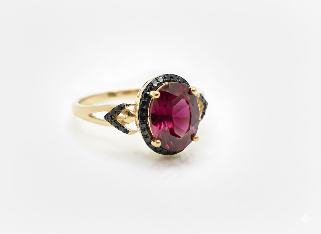 Złoty pierścionek z granatem i czarnymi diamentami