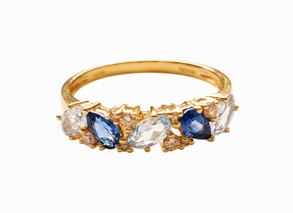Pierścionek wykonany z 14-karatowego złota (próba 585), wysadzany kompozycją topazów i brylantów. Front obrączki zdobią finezyjnie ułożone topazy w dwóch odcieniach: głębokim London Blue oraz świetlistym Sky Blue. Blasku całości dodają lśniące diamenty o krystalicznej barwie. Autentyczność kamieni szlachetnych potwierdza dołączony certyfikat Verony.
